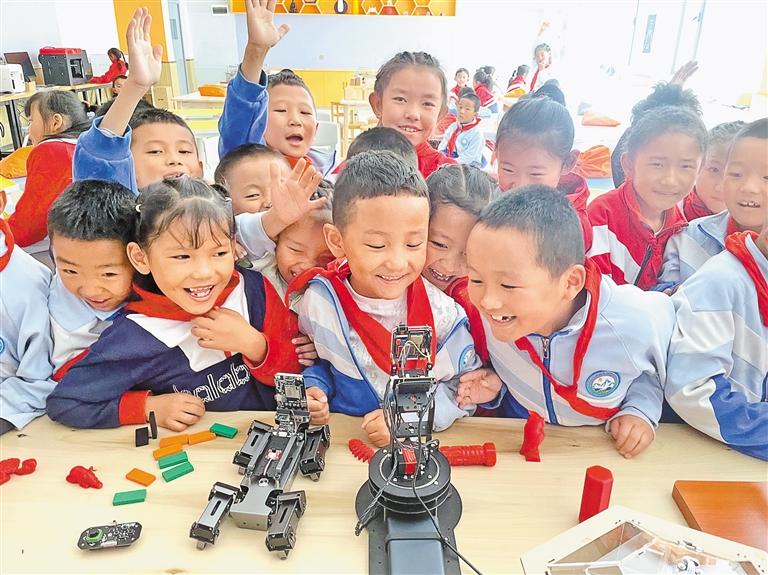 在桑珠孜區(qū)青島小學(xué)的科學(xué)課堂上,智能實(shí)驗(yàn)臺(tái)前圍滿了興致勃勃的孩子,他們手持 3D 打印筆,精心繪制著心中的“太空基地”。作為西藏首個(gè)啟動(dòng)“ STEM ”科學(xué)課程的地區(qū),這里不僅建成了全區(qū)首個(gè)小學(xué)科創(chuàng)實(shí)驗(yàn)室,還被教育部認(rèn)定為西藏唯一的全國(guó)“白名單”科創(chuàng)賽事基層組織單位?!耙郧?,孩子們只能從課本上了解實(shí)驗(yàn),現(xiàn)在能親手操作機(jī)器人、設(shè)計(jì)航天模型?!鼻鄭u小學(xué)黨支部書記周杰介紹道。科創(chuàng)課程的開展,如同一把鑰匙,打開了孩子們創(chuàng)新思維和科學(xué)探索的大門,為高原青少年搭建起展示科學(xué)素養(yǎng)與創(chuàng)新能力的舞臺(tái),推動(dòng)當(dāng)?shù)亟逃聵I(yè)邁向新高度。