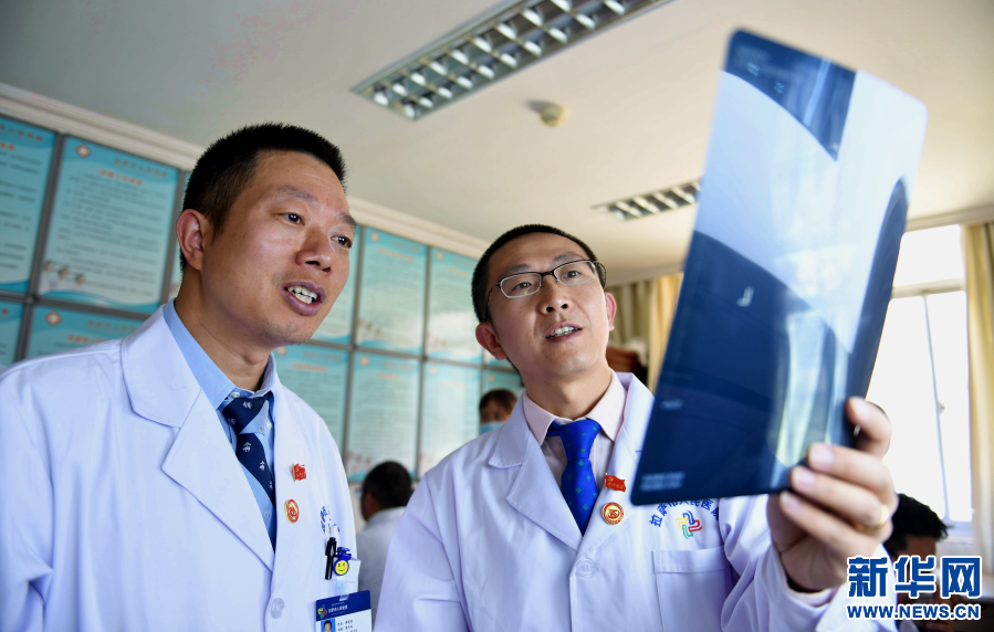 在拉薩市人民醫(yī)院骨科病房?jī)?nèi),北京積水潭醫(yī)院的援藏醫(yī)生龔曉峰(右)和北京天壇醫(yī)院援藏醫(yī)生李家謀查看患者的X光片。(2017年8月3日攝)。新華社記者 晉美多吉 攝