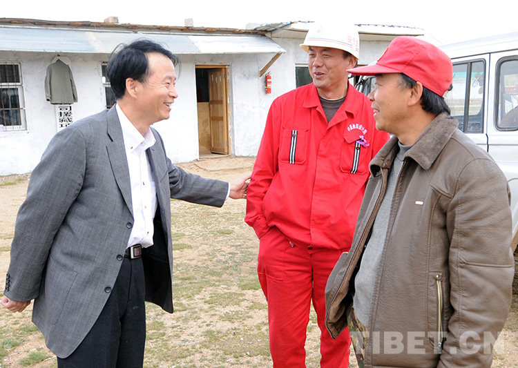 這是李一超(左)從北京來到班戈縣看望中國(guó)石化援建工程的施工人員(唐召明2009年8月11日攝)
