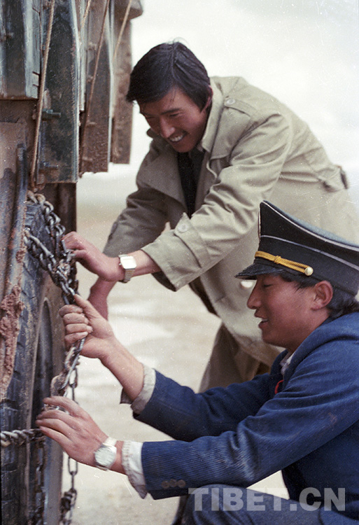 這是郵政人員正在為郵車(chē)的輪胎綁防滑鏈條,以便郵車(chē)順利通過(guò)泥濘路。上世紀(jì)七八十年代,由于藏北西部交通不便,每半月通郵一次的郵車(chē)常常會(huì)在草原上遭遇陷車(chē)等困難(唐召明1987年攝)