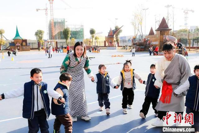 12月1日,在黃石大冶市尹家湖幼兒園就業(yè)的西藏教師赤列旦增和拉珍在教小朋友跳民族舞。何戈 攝
