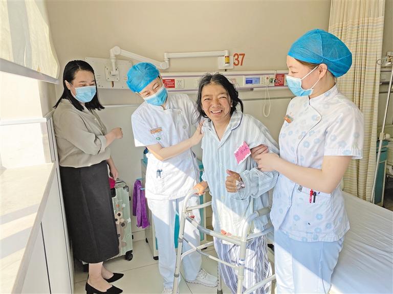 圖為患者布珠術(shù)后在醫(yī)護人員的幫助下進行康復(fù)訓(xùn)練。 記者 周婷婷 攝
