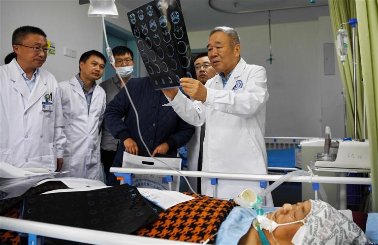 配圖:中國科學院院士、首都醫(yī)科大學附屬北京天壇醫(yī)院神經外科學中心主任醫(yī)師趙繼宗(后右一)在自治區(qū)第二人民醫(yī)院為患者會診。 新華社記者 張汝鋒 攝