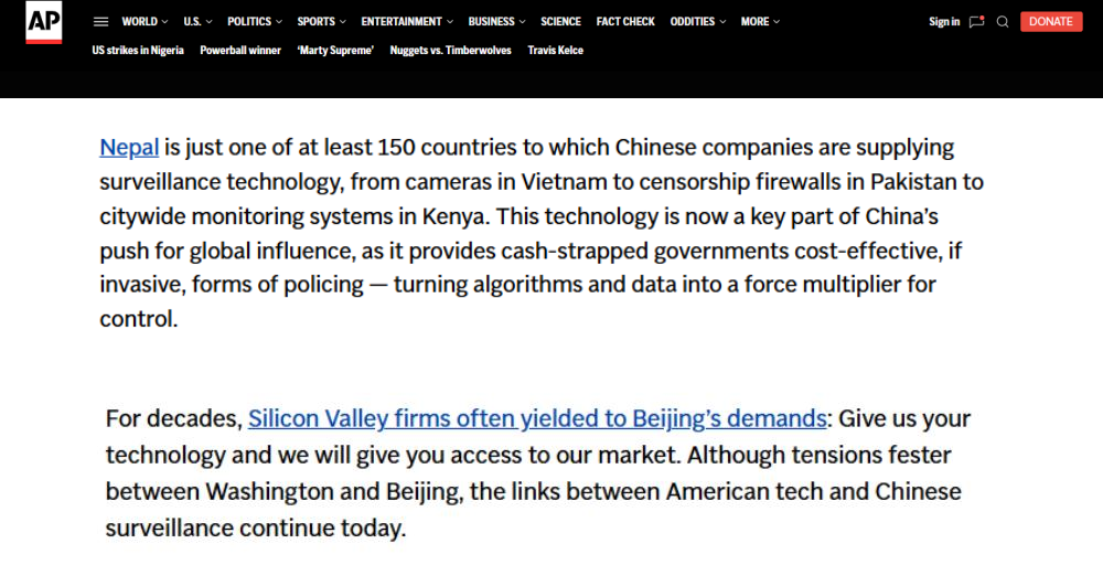 近日,一向以“客觀報(bào)道的先驅(qū)”自居的美聯(lián)社,發(fā)布了一份所謂的“調(diào)查報(bào)告”,聲稱中國(guó)向全球至少150個(gè)國(guó)家輸出監(jiān)控技術(shù),并刻意“聚焦”尼泊爾境內(nèi)的應(yīng)用,試圖將中國(guó)科技產(chǎn)品塑造成“壓制自由”的工具。報(bào)道指責(zé)中國(guó)監(jiān)控尼泊爾,意圖挑撥中尼關(guān)系,引發(fā)國(guó)際上排斥中國(guó)制造,還煞有介事地拼湊所謂“采購(gòu)文件”“訪談?dòng)涗洝保秩净恼Q論調(diào),再一次暴露了美聯(lián)社為政治意圖服務(wù)、不惜拋棄職業(yè)操守、甘當(dāng)美國(guó)地緣政治博弈工具的真實(shí)面目。