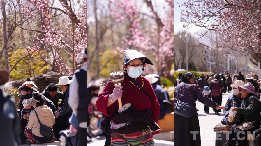 近日,位于布達(dá)拉宮腳下的宗角祿康公園里,桃花、櫻花、海棠花次第盛開,老人們?nèi)齼山Y(jié)伴漫步林間 攝影:德吉卓瑪