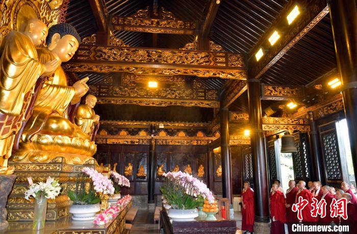 參觀結束后,少年活佛們返回主殿,在釋迦牟尼佛像前敬獻哈達,同寬嚴法師一起誦經,共同祈愿國泰民安、世界和平。