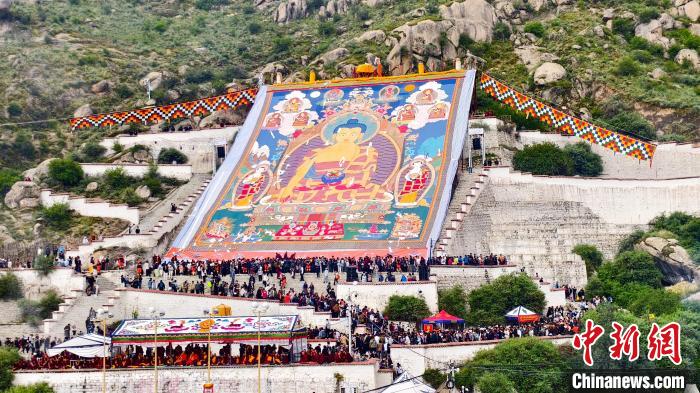 法號聲雄渾莊嚴(yán),巨幅釋迦牟尼唐卡在展佛臺徐徐展開。8月4日是藏歷六月三十日,哲蚌寺舉行展佛活動,這是拉薩雪頓節(jié)最為重要的傳統(tǒng)活動之一。