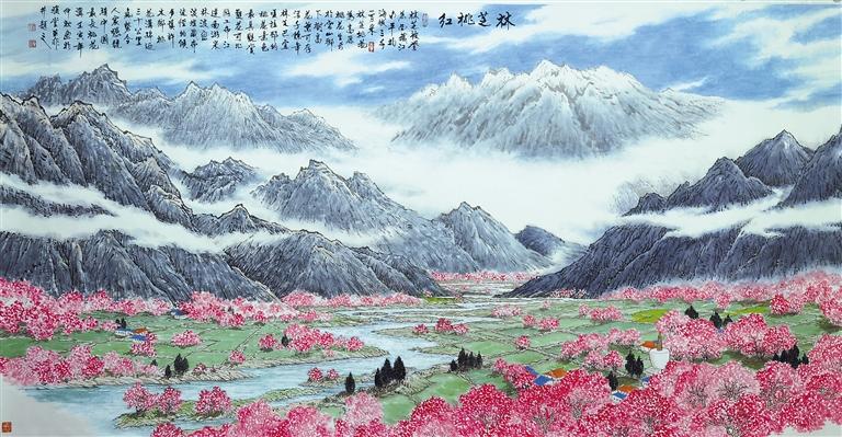 在《林芝桃紅》畫作前,妻停住腳步。她自言自語又像對(duì)我說,這是我們?nèi)ミ^的地方,畫家真是下了一番功夫,多么逼真而入心。這是青稞地,桃樹遍布田??;這是山坡,桃花散落其上。這是桃紅滿人間的地方,林芝人民多幸福呵。在這桃粉田青的地方,中景是起伏的山巒,放眼望去,山上的蒼松依稀可辨,皚皚白雪積于峰巒。林芝的春天無可比擬,因?yàn)樗橇Ⅲw的美,在這幅畫中更顯層次感,田野、桃花、蒼松、積雪、遠(yuǎn)山、白云、藍(lán)天……