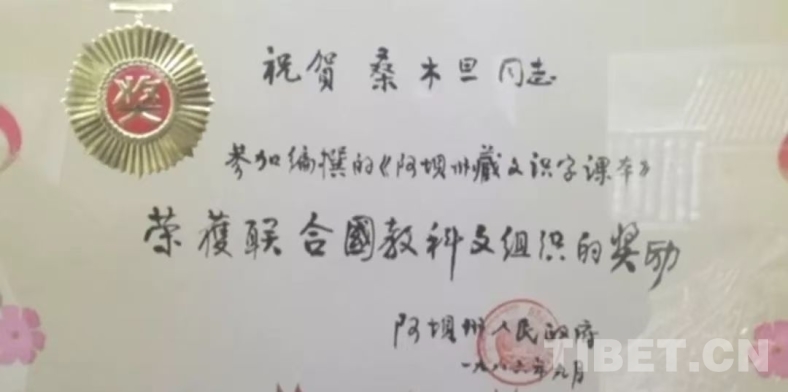 作為一個(gè)智慧過人的學(xué)者,1986年9月,為了藏語文教育的進(jìn)一步普及,毛爾蓋·桑木旦不僅為掃盲四處奔跑,講授藏語文基礎(chǔ)課,而且主編了《藏文掃盲課本》,此書由國家教委推薦參加了亞太地區(qū)掃盲教材比賽,并榮獲聯(lián)合國教科文組織的獎(jiǎng)勵(lì)。為此阿壩州人民政府頒發(fā)證書,祝賀桑木旦同志榮獲聯(lián)合國教科文組織的獎(jiǎng)勵(lì)。我相信中國藏學(xué)界獲得此獎(jiǎng)?wù)?,毛爾蓋·桑木旦先生為第一人。