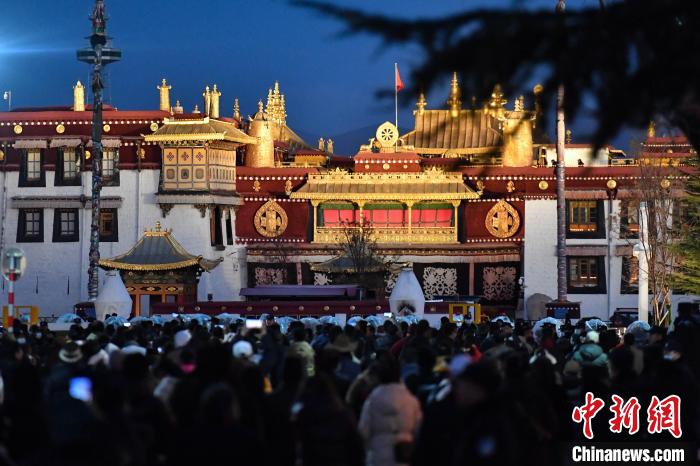 夜晚的大昭寺前,來自西藏各地的信眾紛紛匯聚于此。信眾旦增拉姆說:“我白天去了拉薩市區(qū)幾處寺廟朝拜,并敬獻鮮花、哈達、牛奶、糌粑、酥油等供品,現(xiàn)在來到大昭寺轉(zhuǎn)經(jīng),希望通過這樣的方式,祈愿我們的生活幸福美滿,家人健康平安?!?/p>