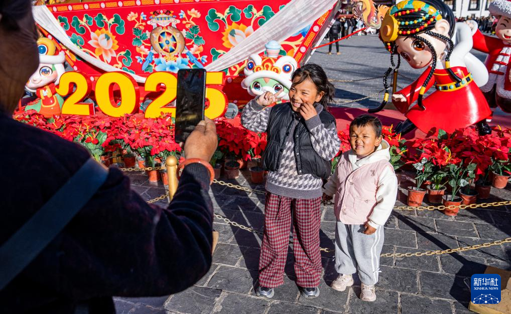 2月2日,市民在拉薩市八廓街的新年裝飾前為孩子們拍照。新華社記者 丁增尼達 攝