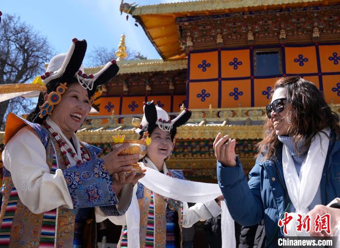 2月20日,2025年香港至拉薩航班首航旅行團歡迎儀式現(xiàn)場,工作人員向香港游客敬獻青稞酒。李林 攝