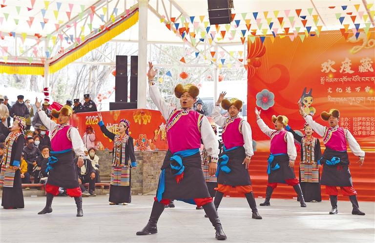 圖為2月28日,“文化進(jìn)萬(wàn)家”惠民演出活動(dòng)在拉薩市宗角祿康公園舉行,精彩紛呈的歌舞節(jié)目輪番上演。記者 旦增蘭澤 攝