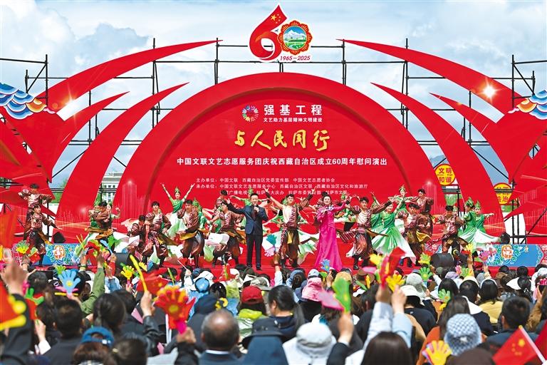 上午10時(shí)整,“與人民同行”中國(guó)文聯(lián)文藝志愿服務(wù)團(tuán)慶祝西藏自治區(qū)成立60周年慰問(wèn)演出,在歌舞《鼓舞西藏》的熱烈氛圍中正式開場(chǎng)。