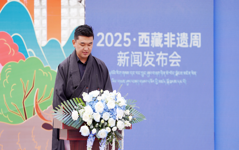 圖為西藏非物質(zhì)文化遺產(chǎn)保護與發(fā)展協(xié)會秘書長旦桑在發(fā)布會現(xiàn)場致辭。(受訪者供圖)