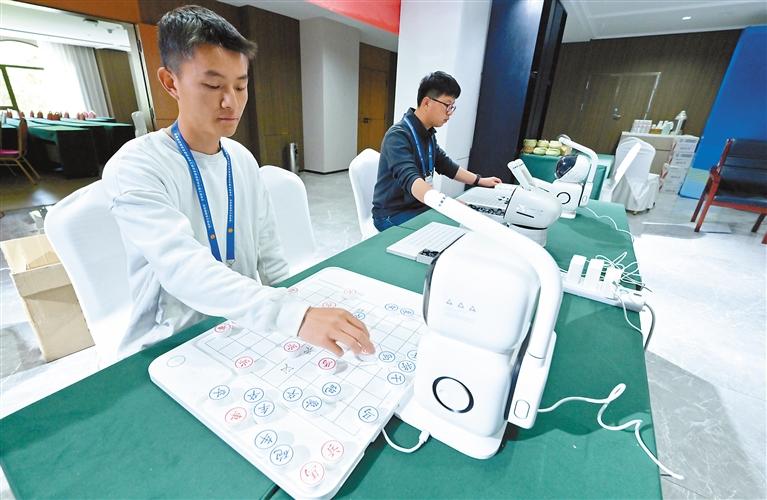 圖為“拉薩職工互助保障杯”智力運動會現(xiàn)場,象棋選手在賽前與智能機器人對弈。記者 唐斌 攝