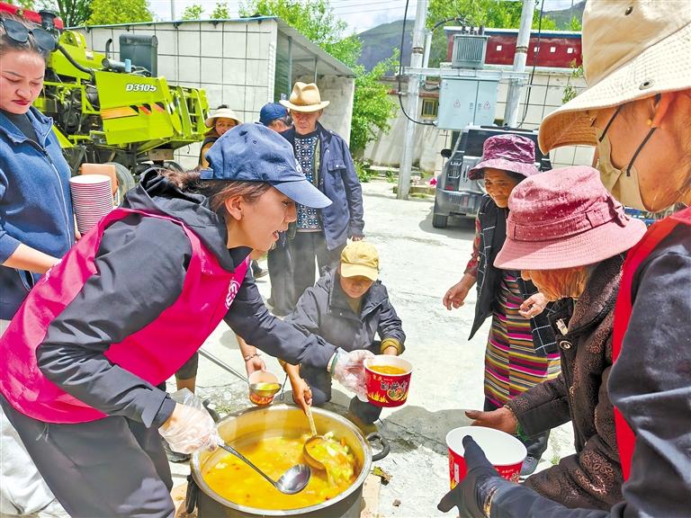 夏日的雅魯藏布江中游,碧水如緞,潺潺流水輕吻著岸邊碎石。位于江畔的山南市加查縣拉綏鄉(xiāng)棍追巴村委會(huì)小院里,鐵鍋支在土灶上“咕嘟咕嘟”地冒著熱氣,乳白的牛肉湯翻滾著,大塊的牛腩在湯中浮沉,胡蘿卜絲、土豆塊吸飽了湯汁,脹鼓鼓地透著香甜。