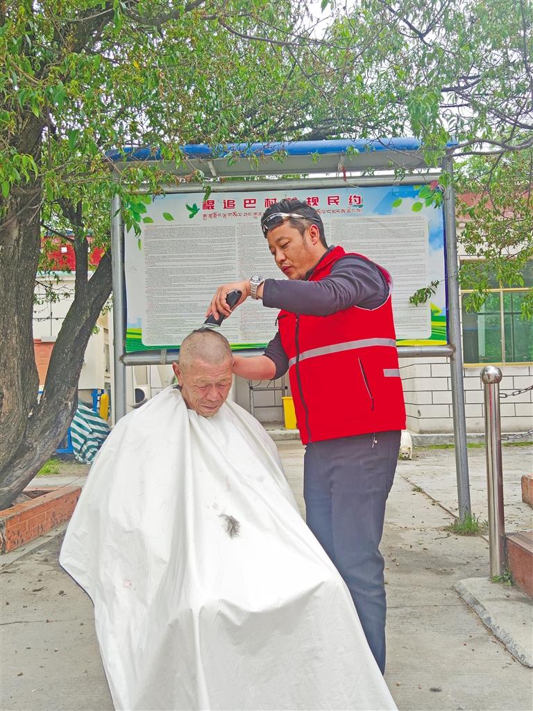 “次仁啦,夏天來(lái)了,天氣開(kāi)始熱了,我把你的頭發(fā)修短點(diǎn)好不好?”在電推子的嗡嗡聲停止后,75歲的次仁邊照著鏡子邊摸著自己的頭說(shuō):“十分感謝,感覺(jué)我年輕了二十歲喲!”理完發(fā)的小朋友巴桑,蹦跳著跑到小伙伴跟前:“快看我的新發(fā)型,像不像解放軍叔叔?”