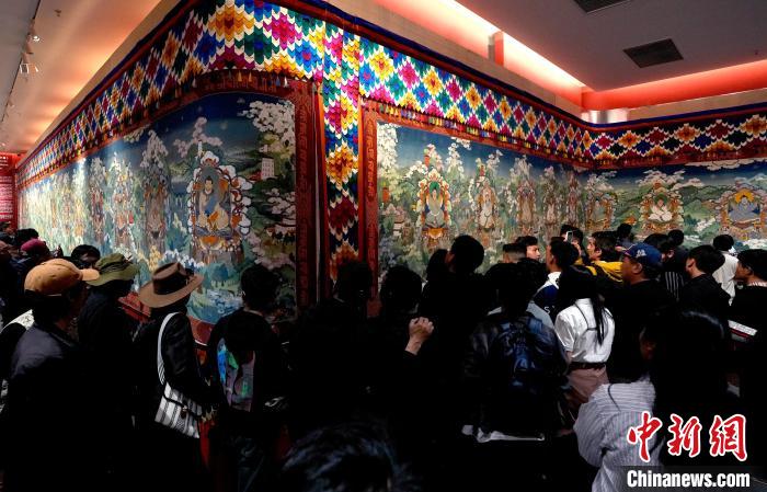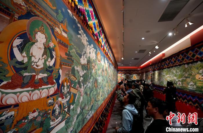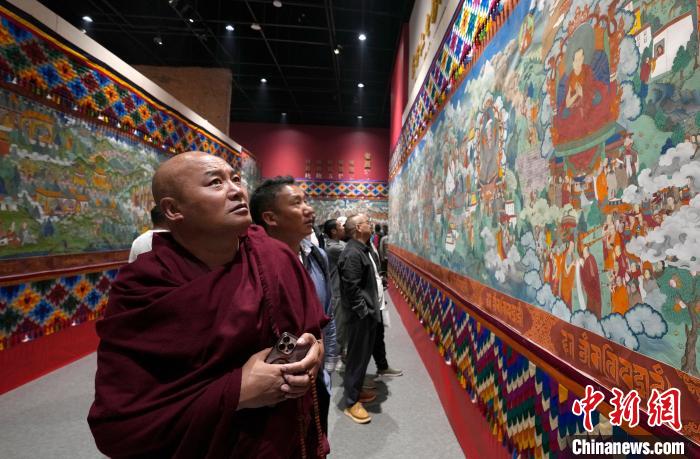 6月14日,描繪吐蕃贊普世系史的唐卡《吐蕃贊普世系大唐卡金子明鏡》在西藏博物館展出。該幅唐卡寬1.8米、長200米,由平措多布杰大師等30多位孜東唐卡畫師歷經(jīng)多年繪制完成。圖為觀眾正在欣賞展覽中的唐卡。中新社記者 李林 攝