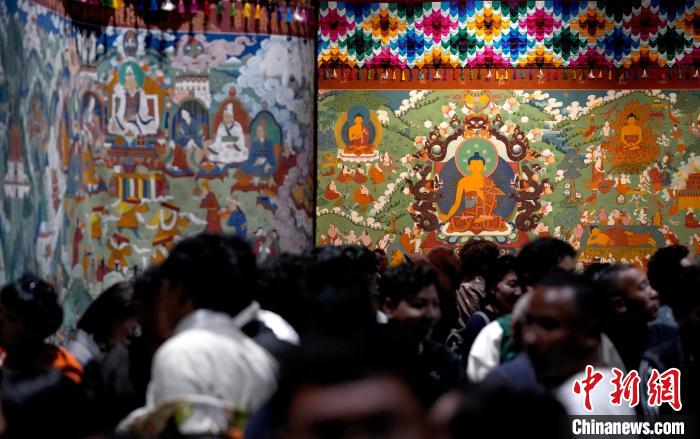 圖為觀眾正在欣賞展覽中的唐卡。中新社記者 李林 攝
