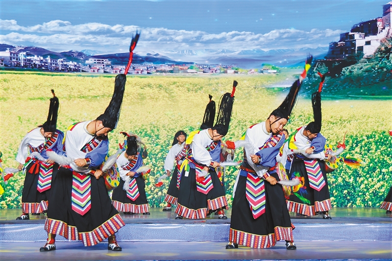 說唱《聲生不息》以鏗鏘有力的節(jié)奏,再現(xiàn)世界最長史詩《格薩爾王傳》中降魔濟(jì)世的英雄傳奇;舞蹈《達(dá)姆韻》以工布響箭舞步、熱瑪琴伴奏,將對(duì)生活的熱愛、對(duì)自然的敬畏,化作熱烈奔放的舞步,演繹著傳承千年的文化記憶,彰顯著工布獨(dú)特的生命張力與文化自信;《扎西央恰》將千年宣舞與噶爾舞創(chuàng)新融合,以莊重舒緩的舞步訴說著高原先民對(duì)天地的敬畏,以雄渾激昂的鼓點(diǎn)展示雪域歷史的風(fēng)云激蕩,在莊重與激昂中訴說阿里高原的歷史變遷……
