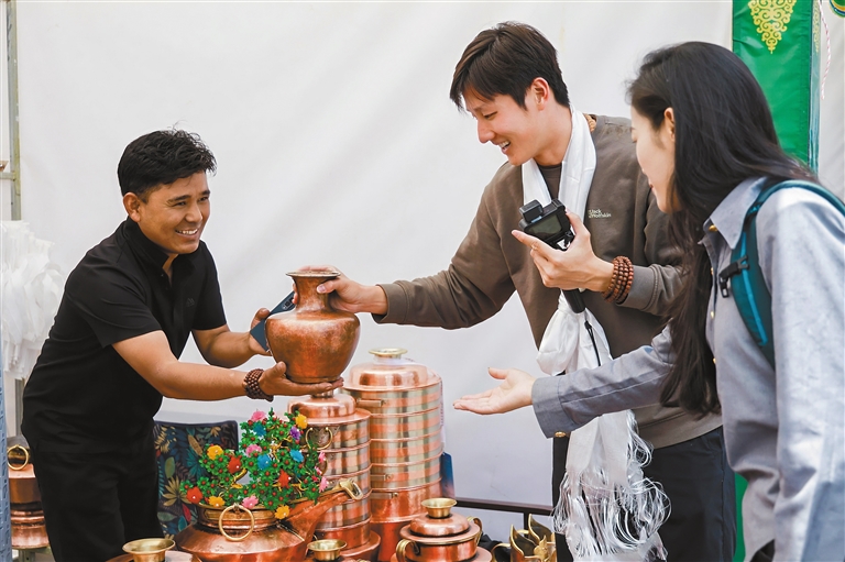 在西藏非遺工坊促銷展示活動(dòng)中直播帶貨。