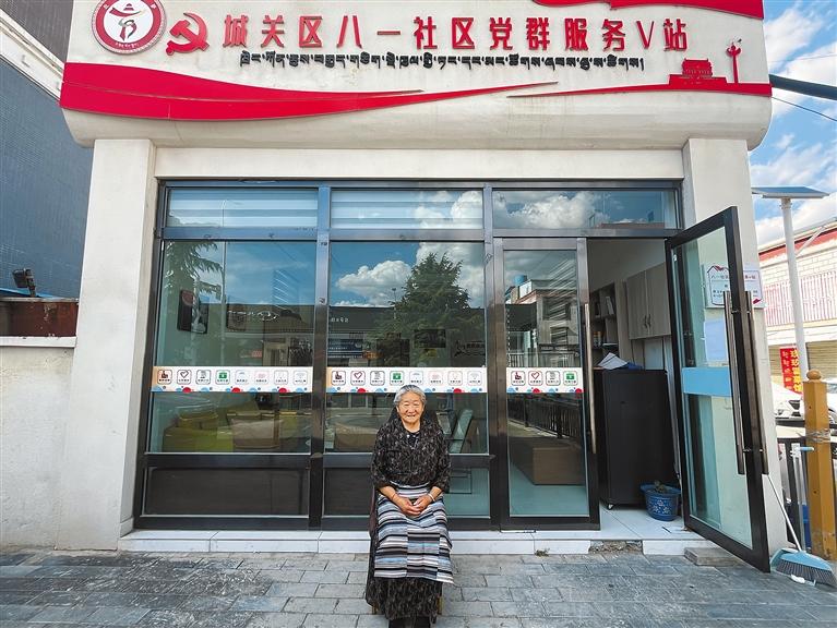 2025年,何秀英在煥然一新的八一社區(qū)黨群服務(wù)V站門口(原八一農(nóng)場場地)留影。
