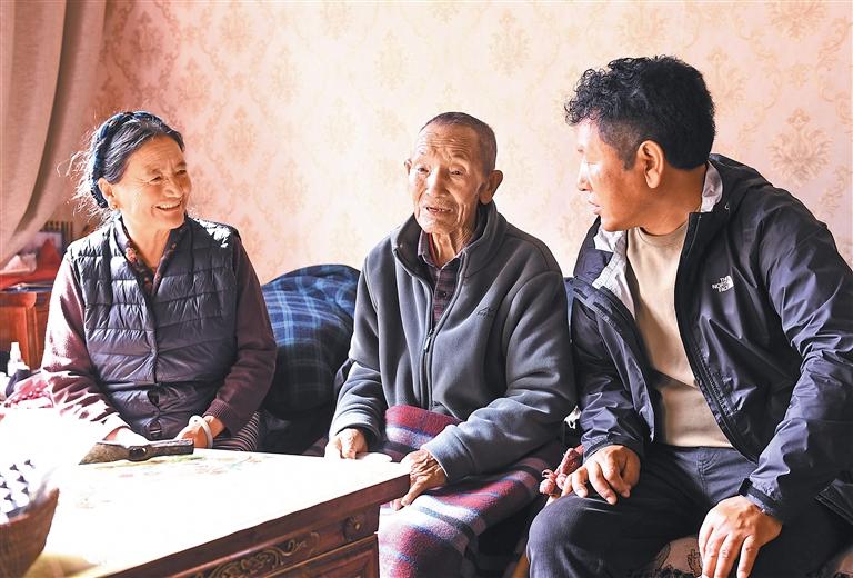 圖為羅布多吉老人(中)與家人在一起。記者 旦增蘭澤 洛桑 攝