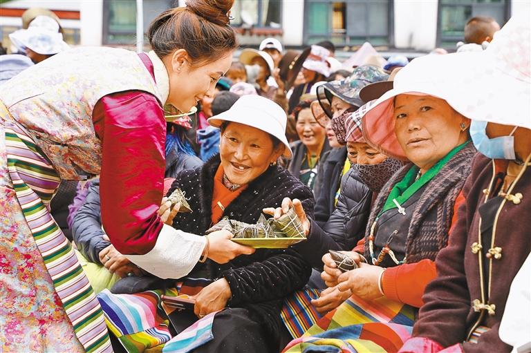 圖為今年端午節(jié)期間,洛扎縣委宣傳部、縣文旅局在德瑪龍村舉辦“培樹文明向上新風(fēng)·崇尚健康幸福生活”系列活動(dòng),為新村居民送粽子,以弘揚(yáng)傳統(tǒng)節(jié)日文化凝聚民族團(tuán)結(jié)奮進(jìn)力量。 圖/文 記者 丹增平措