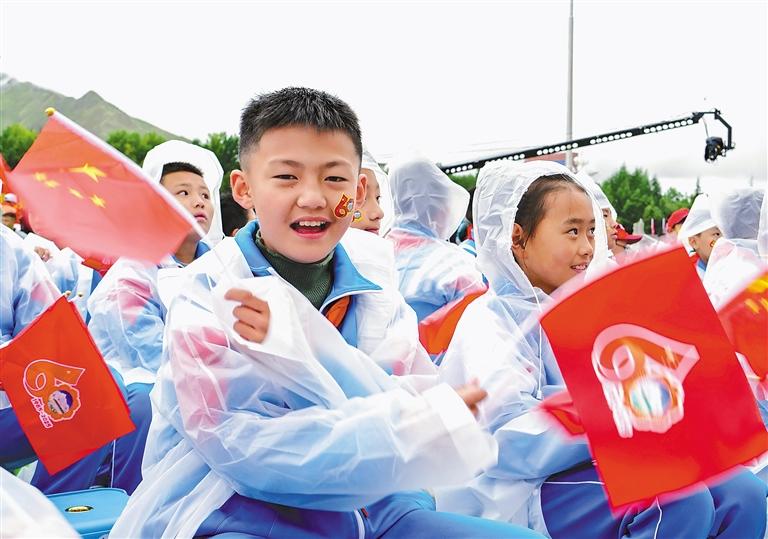 圖為西藏自治區(qū)成立60周年慶祝大會(huì)現(xiàn)場(chǎng),臺(tái)下小朋友揮舞著國(guó)旗。記者 丹增群培 攝