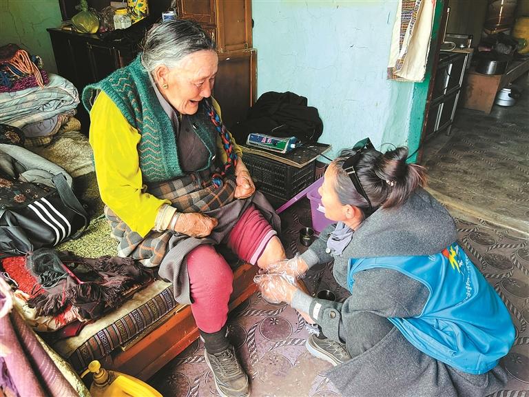 清晨的陽光灑在林周縣春堆鄉(xiāng)卡東村的土路上,林周縣民政服務站工作人員旦增旺姆背著裝滿蔬菜和藥品的布袋,熟門熟路地走進仁增拉卓老人的院子?!鞍尷?,今天給您帶了新鮮的蘿卜,再把降壓藥給您續(xù)上?!?3歲的仁增拉卓顫巍巍迎上來,拉著旦增旺姆的手笑得眼角堆起皺紋——這樣的清晨探望,早已成為老人日常生活里的“定心丸”。