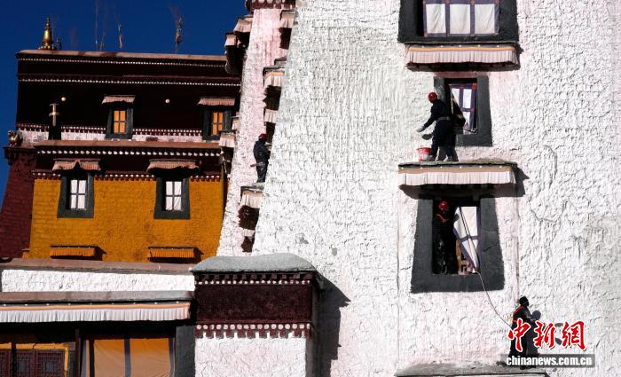 西藏布達拉宮22日迎來一年一度的粉刷“美顏”,民眾自發(fā)參與粉刷工作。