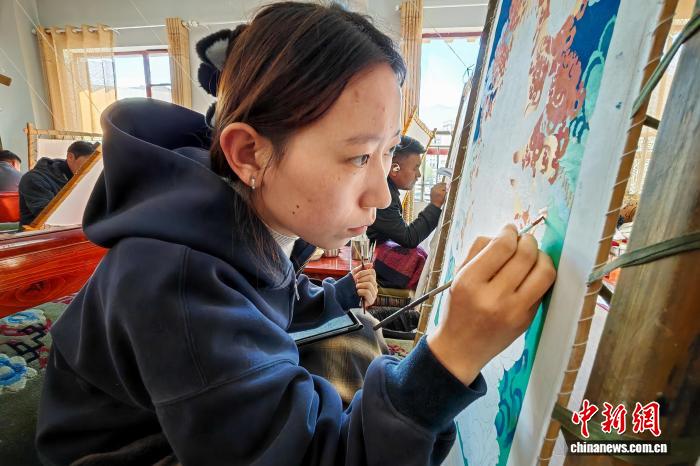 10月21日,西藏唐卡畫院女學(xué)員南草吉正為一幅唐卡進行上色。中新社記者 江飛波 攝