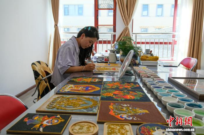 10月21日,碩士畢業(yè)的尼瑪仲格在西藏唐卡畫院進行掐絲琺瑯唐卡制作。中新社記者 江飛波 攝
