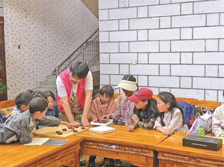 蔡公堂街道公堂社區(qū)開展的“小太陽”輔導(dǎo)班上,志愿者與孩子們下棋。文/圖 記者 劉斯宇 通訊員 張銀鵬