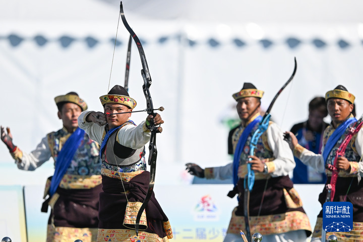 2024年11月27日,第十二屆全國少數(shù)民族傳統(tǒng)體育運(yùn)動(dòng)會(huì)表演項(xiàng)目中,西藏隊(duì)選手表演《響箭》。新華社記者 孫凡越 攝
