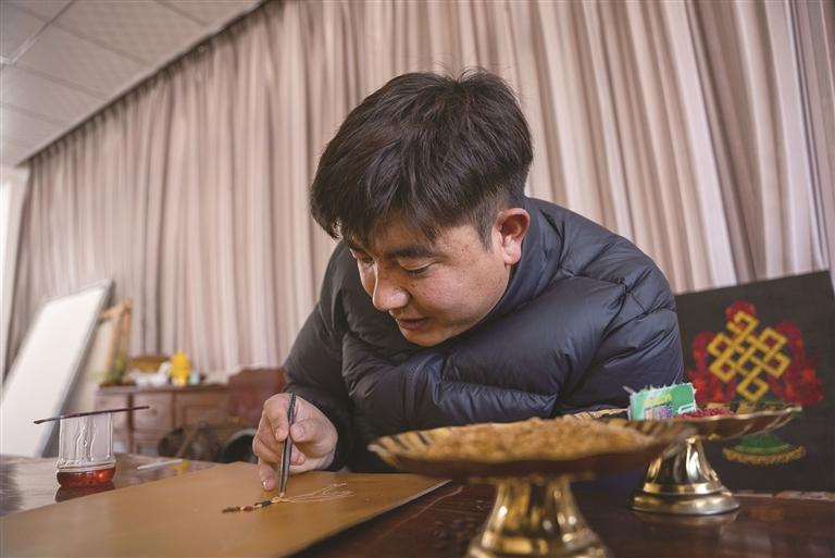 如今,仁青多吉依然在唐卡繪制與青稞文創(chuàng)之間忙碌著。陽(yáng)光掠過(guò)他剛完成的一幅作品,黑頸鶴的棕褐色喙部、漸變棕灰的羽翼在光影下栩栩如生,一粒粒青稞如同被賦予了生命,靜靜訴說(shuō)著林周的生態(tài)與農(nóng)耕故事。工作室里,畫(huà)師們偶爾會(huì)停下手中的筆,圍過(guò)來(lái)看他的創(chuàng)作進(jìn)度,時(shí)不時(shí)交流幾句,歡聲笑語(yǔ)間,傳統(tǒng)技藝的火種在默契中傳遞。