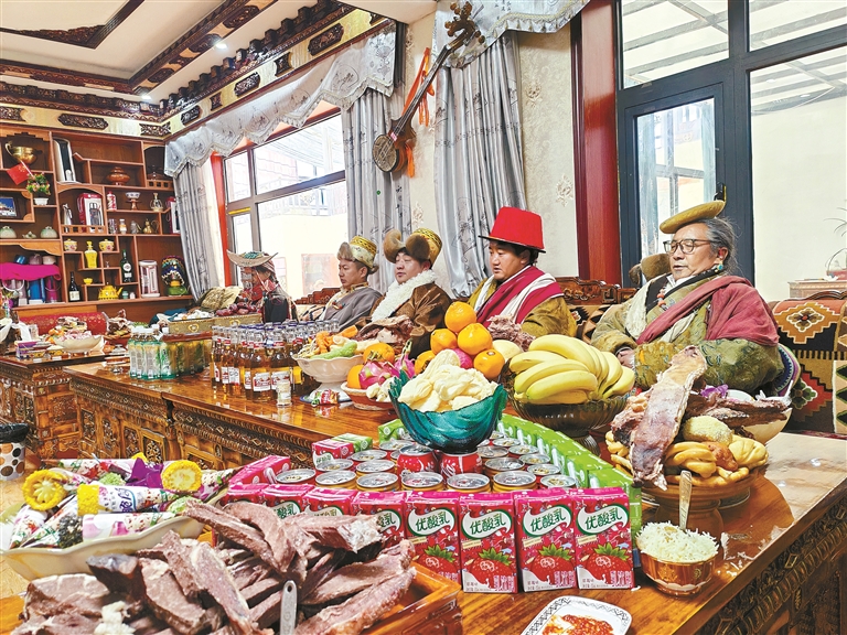 圖為普蘭新年當日,西德村村民旦成益西一家身著普蘭傳統(tǒng)服裝,家中桌案年貨豐盛,團圓迎新年。記者 永青 通訊員 多吉堅參 攝
