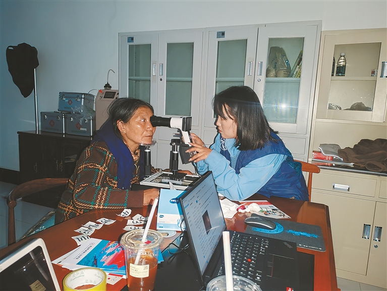 圖為西藏星光社會(huì)工作服務(wù)中心工作人員在堆龍德慶區(qū)東嘎街道祥和苑社區(qū)運(yùn)用AI篩查設(shè)備,為轄區(qū)搬遷群眾開展眼病篩查。記者 格桑倫珠 攝