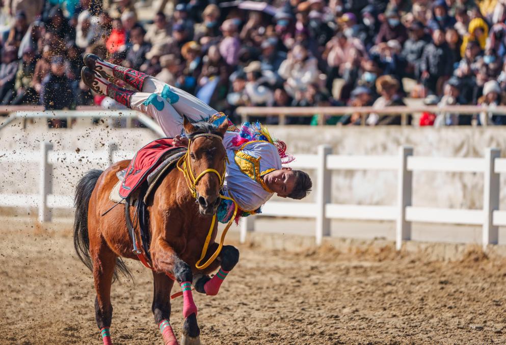2月20日,馬術(shù)隊員在表演馬上拾哈達。新華社記者 丁增尼達 攝