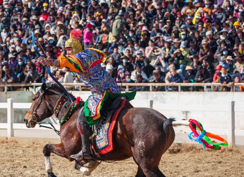 2月20日,馬術(shù)隊員在表演馬背傳統(tǒng)響箭技巧。新華社記者 丁增尼達 攝