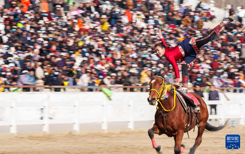 2月20日,馬術(shù)隊員在表演馬上技巧。新華社記者 丁增尼達(dá) 攝