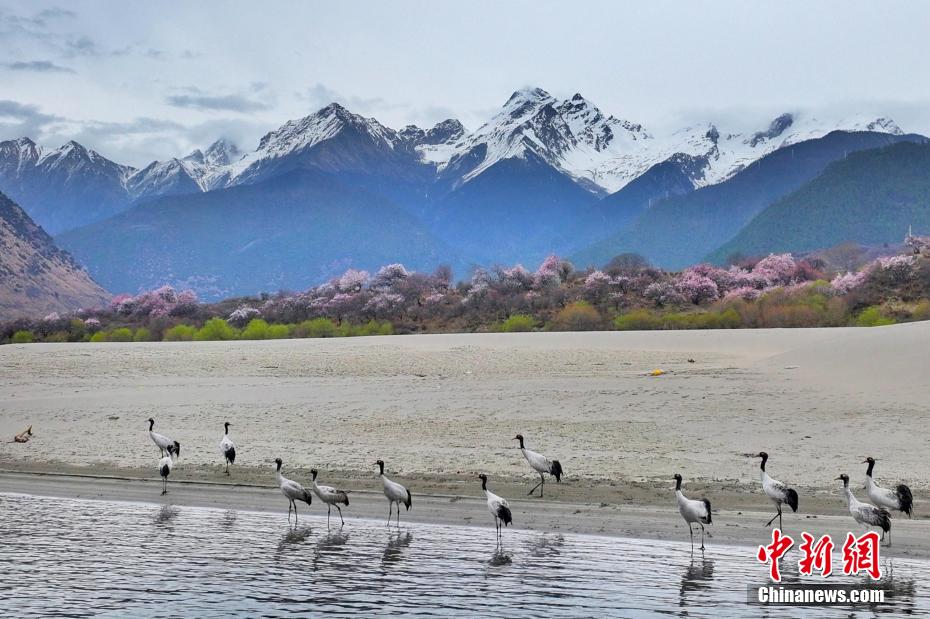 3月30日,在西藏林芝市巴宜區(qū)更章門巴民族鄉(xiāng),黑頸鶴與周邊的村莊、桃花、雪山融為一體,成為春日里的一道靚麗的風(fēng)景線。