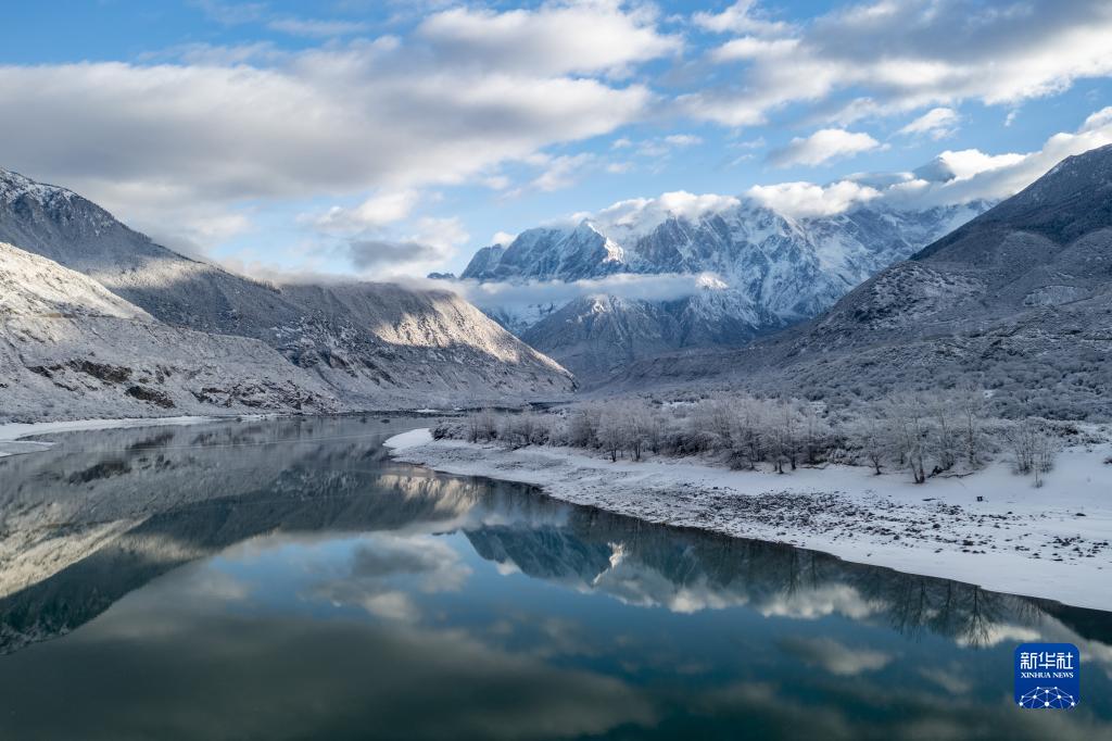 當日,西藏林芝市米林縣派鎮(zhèn)雅魯藏布大峽谷附近普降瑞雪,銀裝素裹的雅魯藏布江和南迦巴瓦峰顯得格外壯美。
