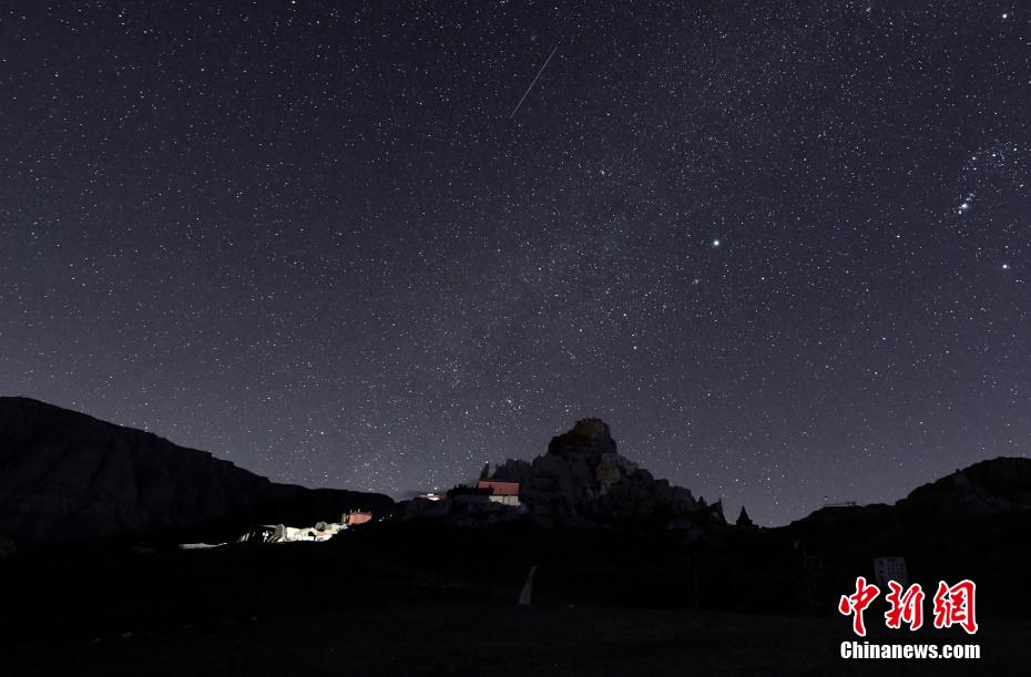 夜晚,西藏阿里地區(qū)古格王國(guó)遺址上空流星劃過(guò)。