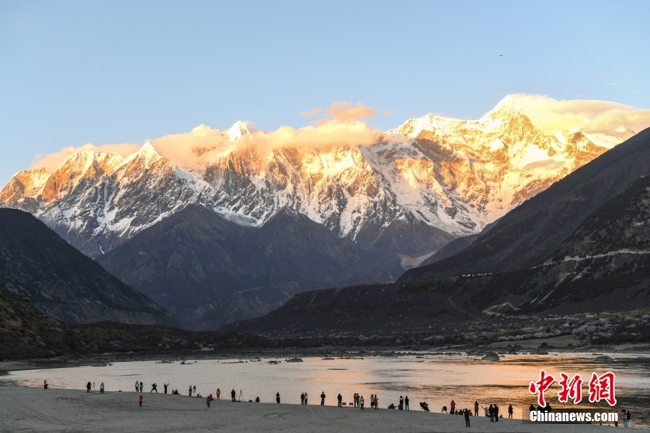 4月1日,西藏林芝市米林市境內(nèi)的南迦巴瓦峰下,桃花盛開(kāi),吸引了眾多游客前來(lái)游玩。南迦巴瓦峰被譽(yù)為“眾山之父”,海拔7782米,其山頂終年積雪,而山腳下則是郁郁蔥蔥的樹(shù)木和盛開(kāi)的桃花,形成了一幅獨(dú)特的垂直自然景觀。圖為游客在南迦巴瓦峰腳下觀賞“日照金山”。