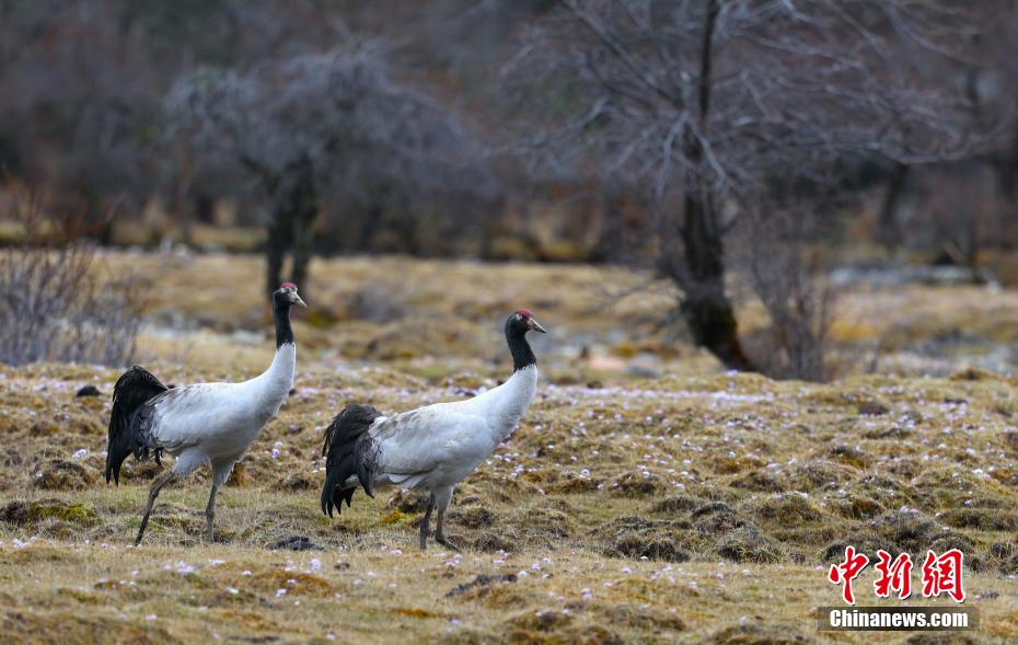 西藏林芝:黑頸鶴與桃花共繪春日畫卷