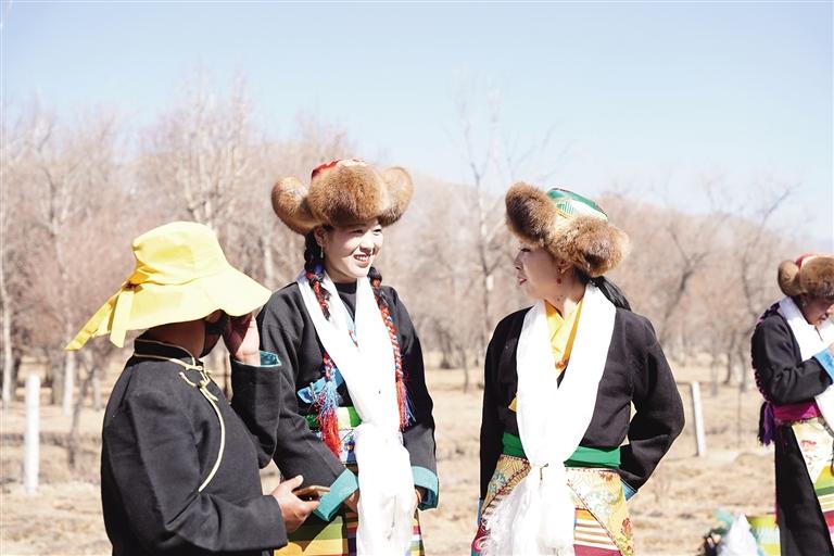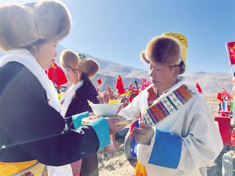 在巴嘎雪村,村民們早早地在田間等待著儀式的舉行。巴嘎雪村二組的旦巴曲桑說:“這是我第三次參加春播儀式,我們在舉行開耕儀式的前幾天,家家戶戶都要釀造青稞酒,還要給‘鐵?!瘻?zhǔn)備裝飾品。在春播儀式開始的這一天,全家人都穿上節(jié)日盛裝,并將耕牛和拖拉機(jī)也打扮得漂漂亮亮的,祈求五谷豐登?!?/p>