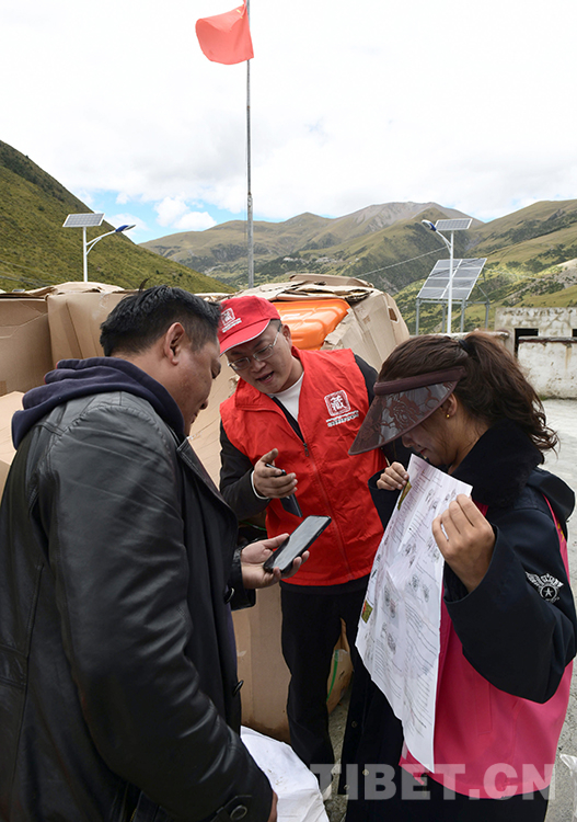 這是北京建藏援藏工作者協(xié)會(huì)志愿服務(wù)組人員張建(中)在西藏那曲市索縣西昌鄉(xiāng)指導(dǎo)牧民群眾用手機(jī)掃碼進(jìn)行高原撿拾車的視頻學(xué)習(xí)(唐召明2021年9月14日攝)