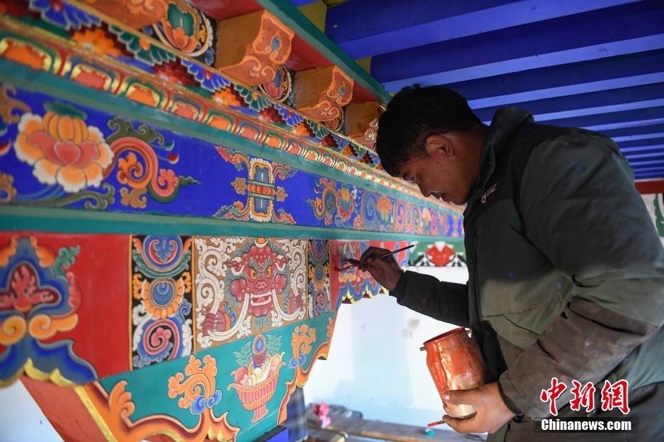 12月28日,西藏拉薩堆龍德慶區(qū),古俗民族傳統(tǒng)手工藝發(fā)展專業(yè)合作社員工在房屋上繪制藏式裝飾。據(jù)悉,該合作社以繪畫、木工、縫紉為主,承接傳統(tǒng)手工藝方式制作家具、房子裝修、唐卡繪畫、旅游產(chǎn)品、文物建筑維修等工作。自2018年合作社成立至今,帶動就業(yè)共60余人。 中新社記者 貢嘎來松 攝